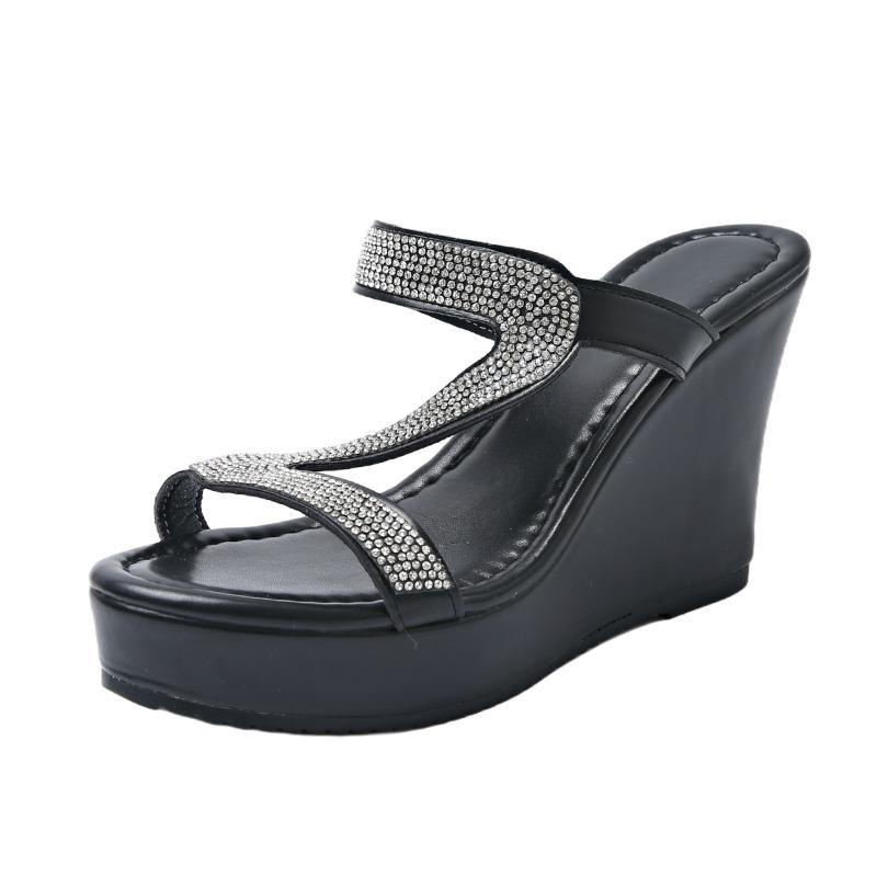 Мода Плюс Размер 2025 Лето Открытый Носок Женские Шлепанцы Горячая Распродажа Кристальные Танкетки Сандалии Платформа Мода Высокое Качество Платье Шлепанцы 43 чёрный