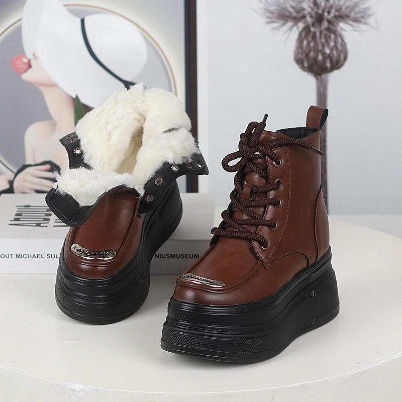 Мода 12СМ Натуральная Кожа Зима Осень Труба Плюш Весна Ботильоны до Щиколотки Мода Молния Женские Мокасины Обувь на Платформе и Танкетке 34
