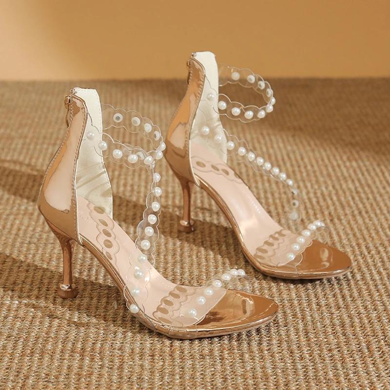 Мода 2024 года, новые летние босоножки на высоком каблуке, женские туфли на шпильках с жемчужным ремешком, прозрачные туфли с открытым носком на высоком каблуке 34