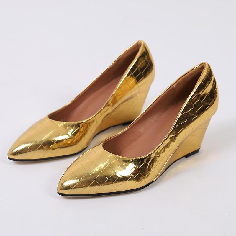 Мода 2025 Весна Лето Клиновидные каблуки Женская обувь для вечеринок Мода Офис Остроносые Большой размер 34 42 Золото Серебро Черный Женские туфли-лодочки 42 золотой