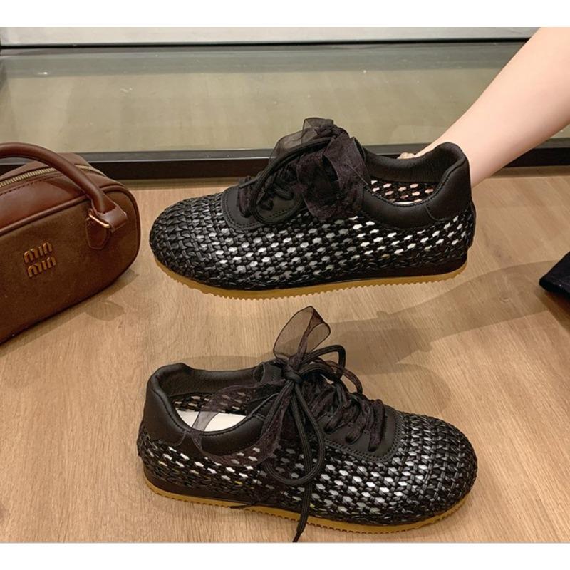 Мода 2025 Весна Новые Балетки Круглый Носок Мелкий Вырез Сетчатая Ткань Дышащие Металлическая Пряжка Мягкая Подошва Нескользящие Одинарные Туфли 35 чёрный