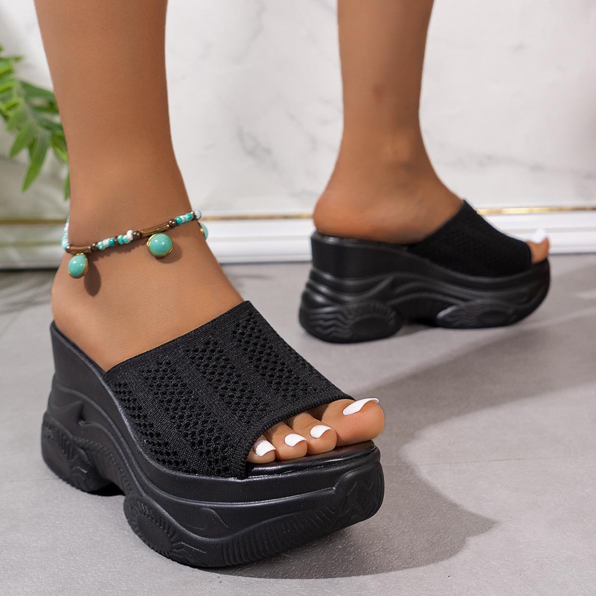 Мода 2025 Лето Женские Сандалии Однотонные Большой Размер Платформа Танкетка Высокий Каблук Открытый Носок Римский Стиль Сетка Элегантные Летние Сандалии Шлепанцы 43 чёрный