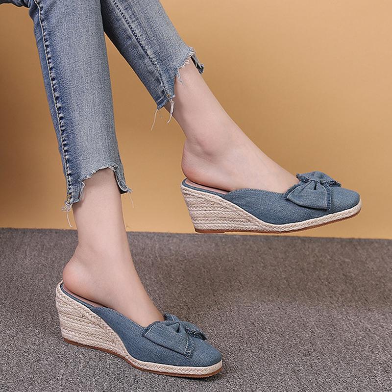 Мода 2025 Туфли из денима с бантом-бабочкой Женские туфли на высоком каблуке Клинья Шлепанцы Закрытый носок Босоножки на платформе Женские шлепанцы на плоской подошве Конопляные мюли Женские 8.5 синий