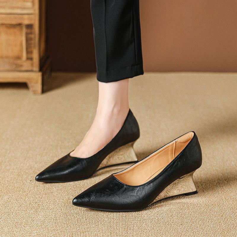 Мода FHC 2024 Новые Туфли из Натуральной Кожи Рабочие Женские Туфли-Лодочки, Высокий Каблук Танкетка, Острый Носок, На Слипонах, Весна/Осень, Коричневые, Черные, Дропшиппинг 34