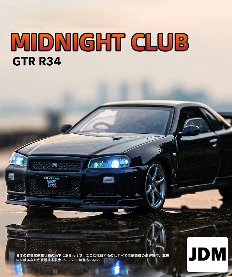 Модель автомобиля под давлением Nissan GTR R34 1:32, модель автомобиля со звуком и светом, Коллекция игрушечных автомобилей для детей, подарки для д...