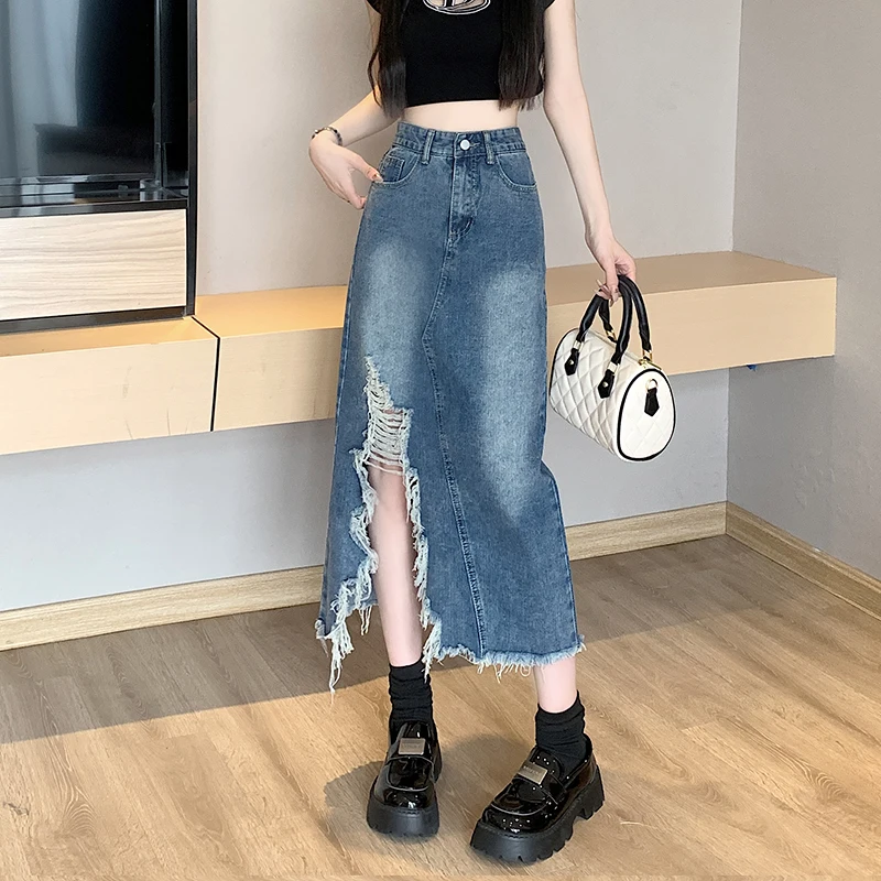 Женская Асимметричная джинсовая юбка с разрезом, Привлекательная юбка-карандаш с завышенной талией в Корейском стиле, винтажная юбка-карандаш, одежда на весну и лето