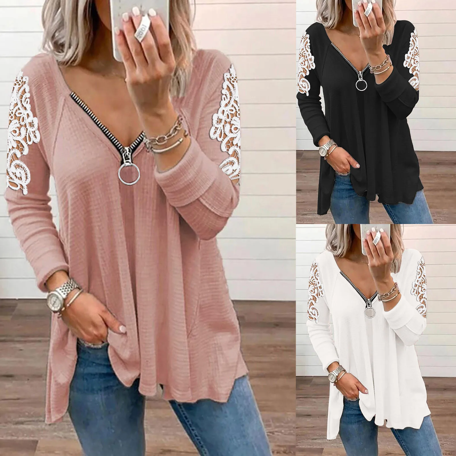 Модная Повседневная кружевная вязаная блузка на молнии, зимние топы с V-образным вырезом, женская рубашка с длинным рукавом, блузки, женская ...