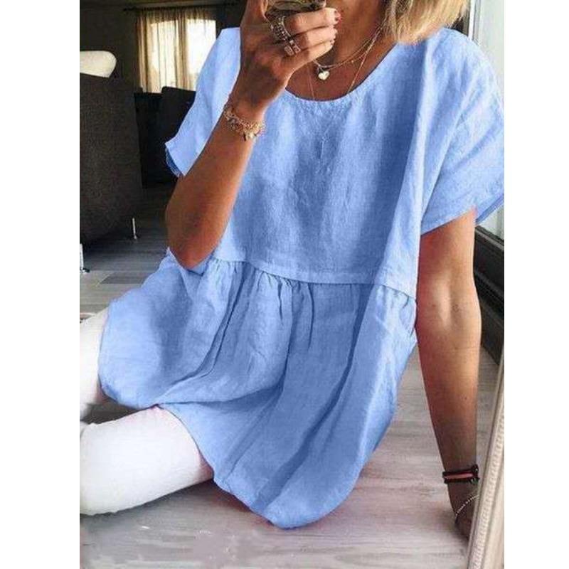 Модная блузка с круглым вырезом, коротким рукавом, повседневная, длинная, однотонная, плиссированная, больших размеров, офисная, элегантная, простая, свободная, летняя, милая рубашка-платье, женская одежда XXXXL светло-синий