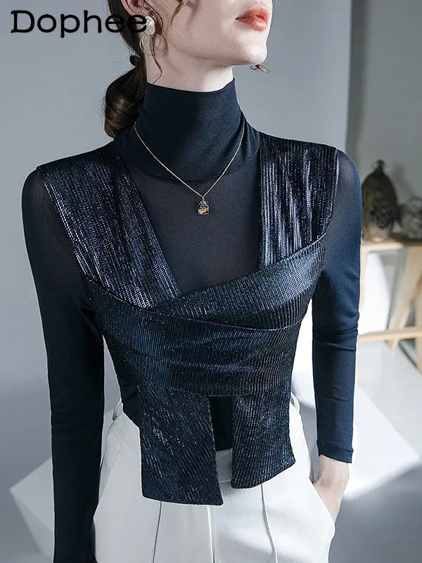 Модная дизайнерская футболка с высоким воротником, Женская осенне-зимняя новая внутренняя одежда, нижнее белье, сетчатый топ с прострочкой, 2023