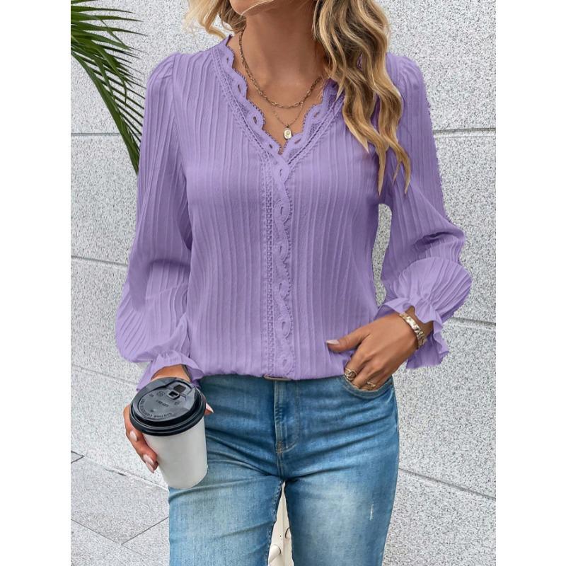 Модная женская блузка с длинным рукавом и V-образным вырезом, элегантная кружевная белая рубашка в стиле пэчворк, женские новые топы, ажурные однотонные винтажные облегающие простые женские рубашки 3296 XL фиолетовый
