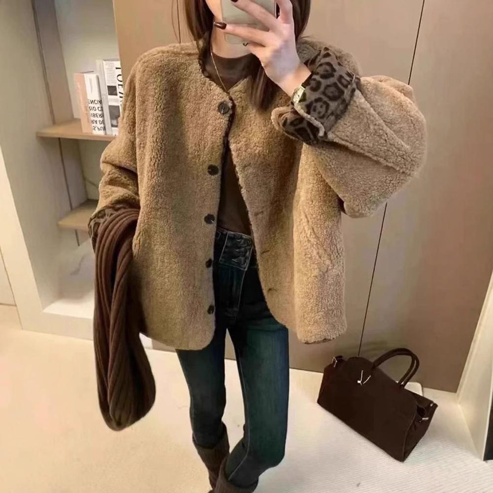 Модная женская куртка из овечьей шерсти с леопардовым принтом, 2025, зима, новинка, утолщенная, теплая, меховая, цельная S темно-коричневого