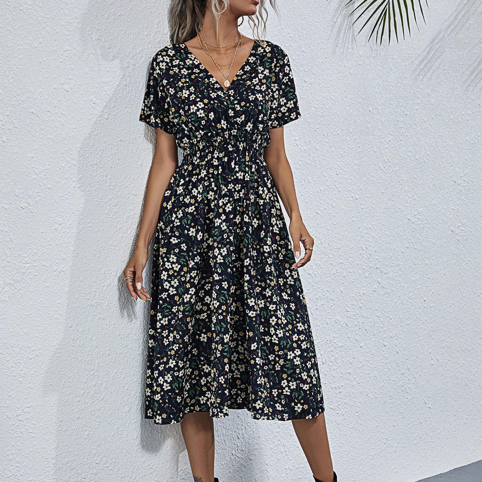 Модная женская повседневная юбка-миди с v-образным вырезом и принтом, платье с эластичной резинкой на талии XL тёмно-синий
