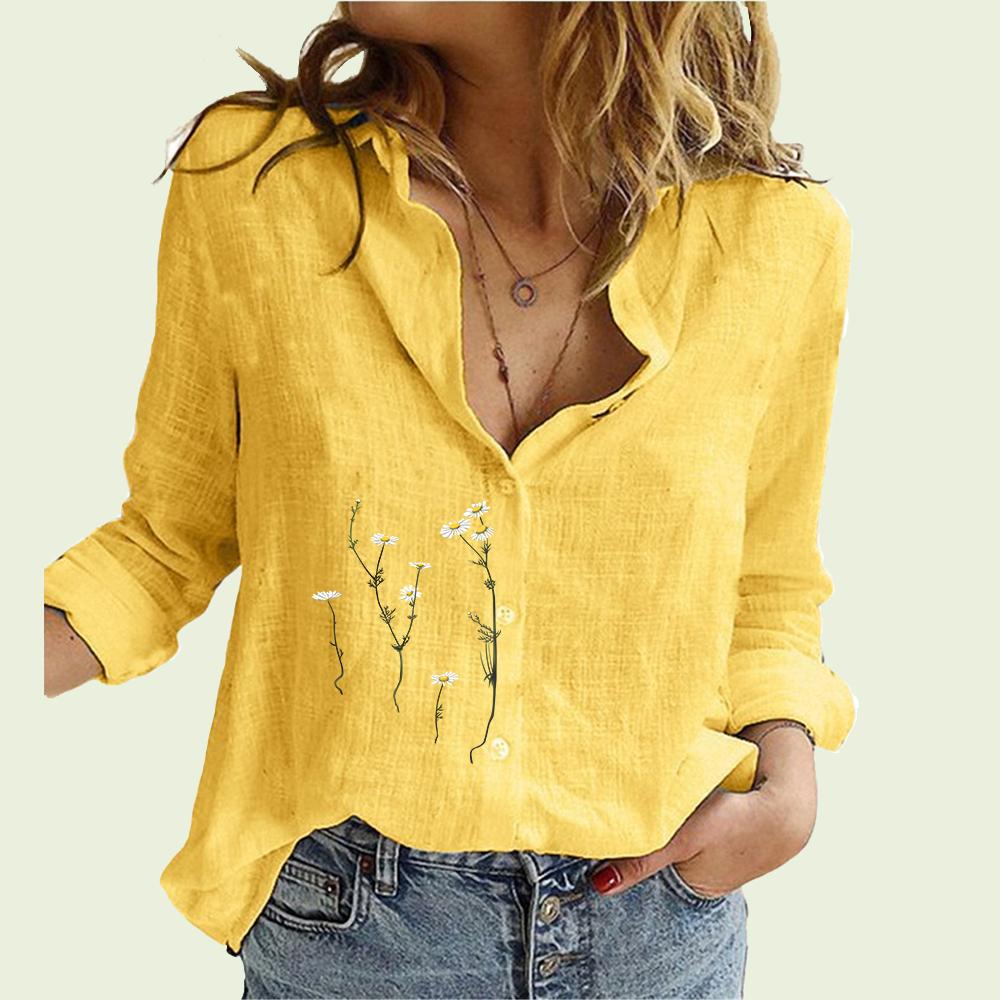 Модная женская рубашка с цветочным принтом, весенне-осенняя повседневная льняная рубашка на пуговицах, женские блузки с длинными рукавами 5XL жёлтый