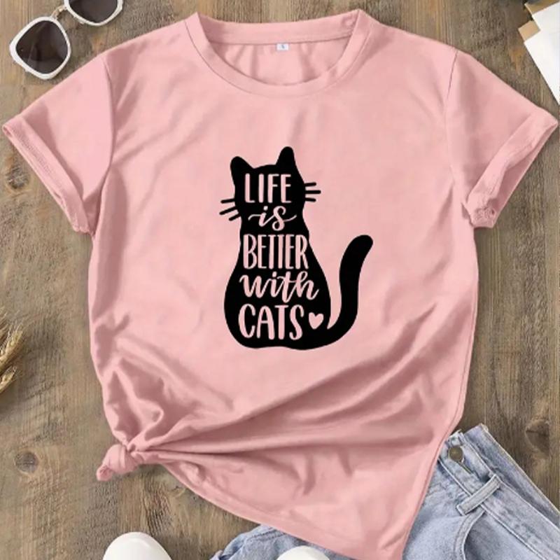 Модная женская футболка с принтом кошачьего слогана, забавная повседневная футболка с круглым вырезом и короткими рукавами, летняя женская футболка S розовый