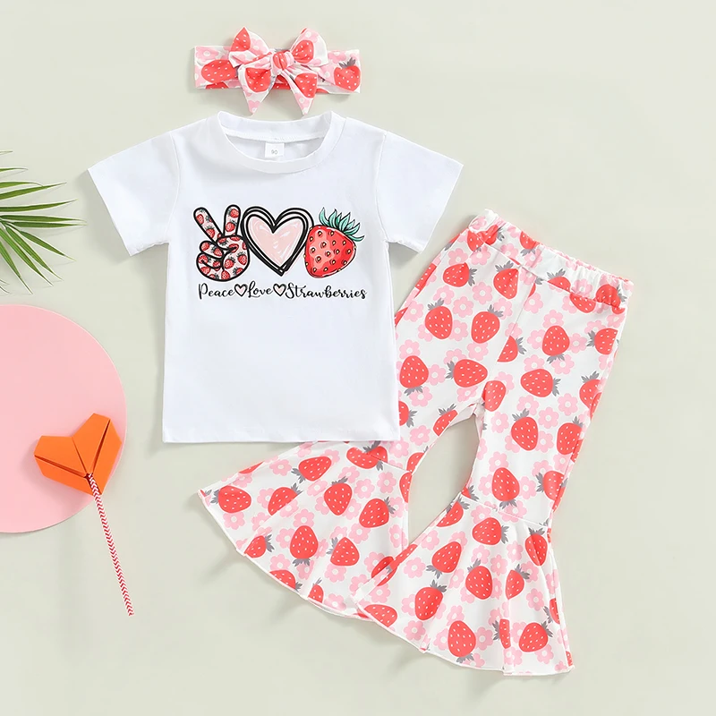 Модная летняя детская одежда для девочек, футболка с коротким рукавом с принтом клубничного сердца + расклешенные длинные брюки + повязка на...