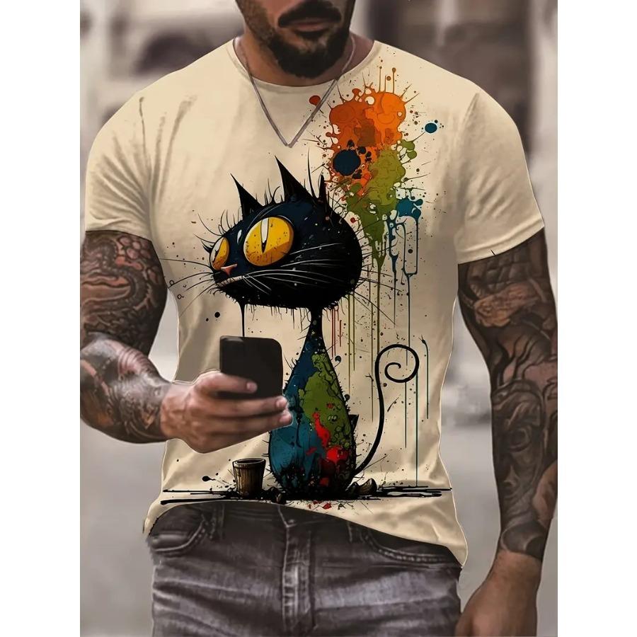 Модная мужская футболка унисекс с графическим принтом кота. Удобная футболка с круглым вырезом для летнего отдыха на природе и повседневного стиля. Легкий привлекательный дизайн. Основной предмет гардероба. 3XL