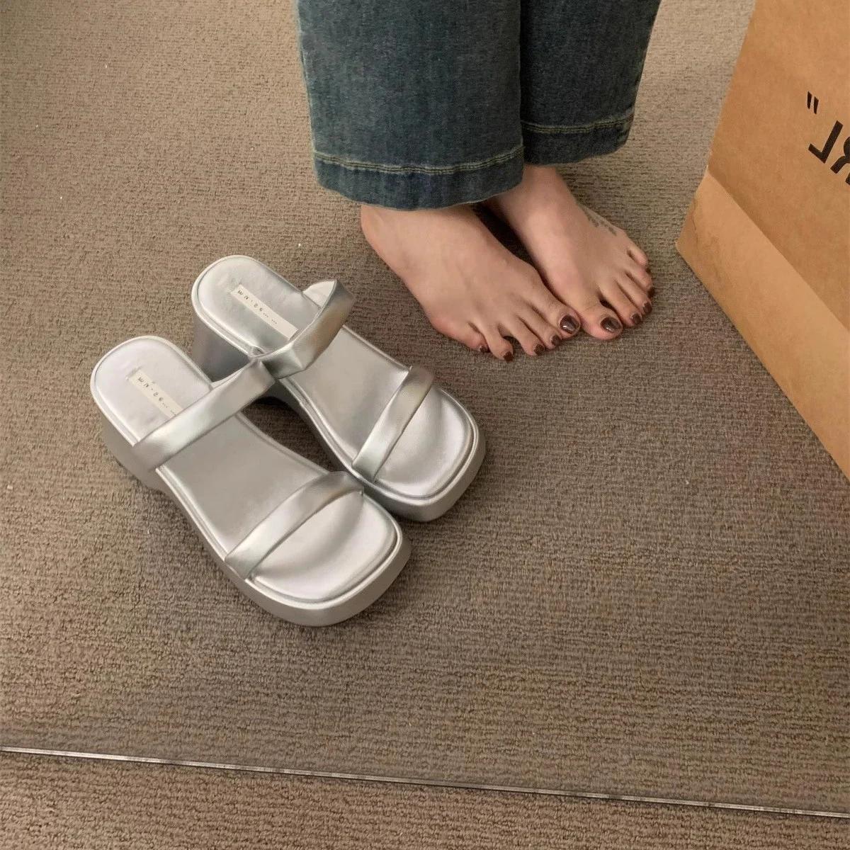 Модная обувь женская 2024 г., женские тапочки с открытым носком, модные женские тапочки с квадратным носком, на платформе, на высоком каблуке, женская уличная обувь 40 серебряный