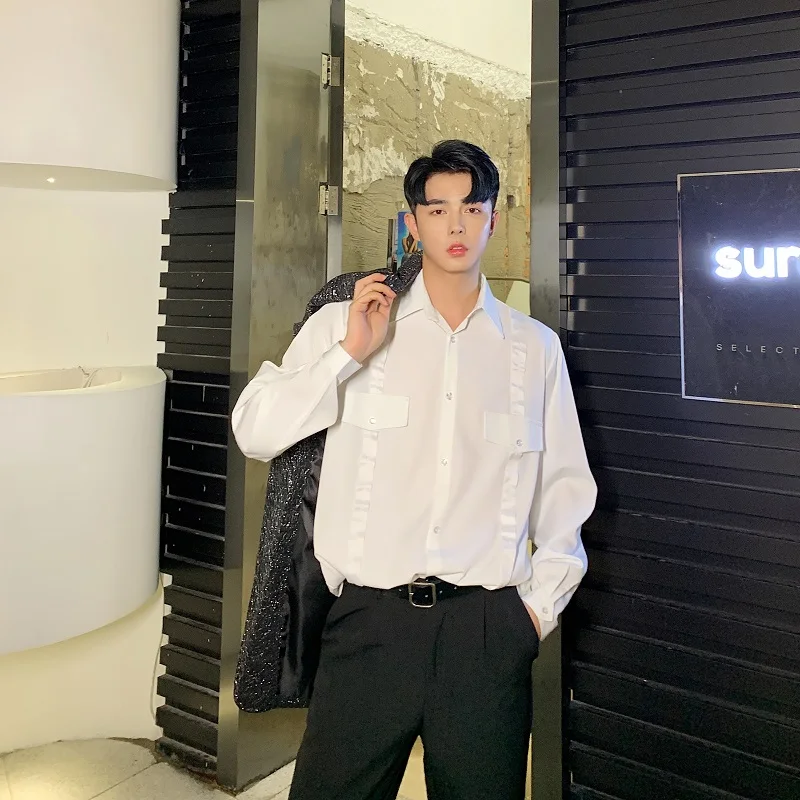 brand streetwear shirt spring fashion casual long sleeves turn-down collar solid color men clothing homme u6153 men's shirts, White;black