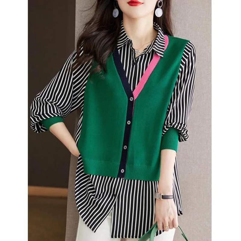 Модная полосатая рубашка с лацканами из двух предметов с имитацией двух частей, женская одежда, новинка сезона осень 2023, свободные повседневные топы, асимметричная блузка