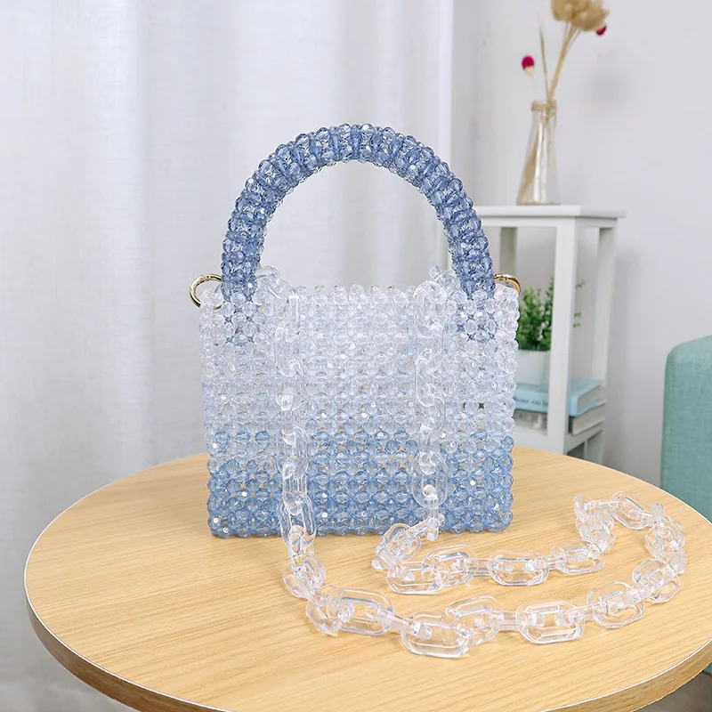 Модная прозрачная сумка-тоут ручной работы с градиентными синими бусинами для женщин 2022 Высококачественная плетеная вручную акриловая мини-сумка через плечо с цепочкой
