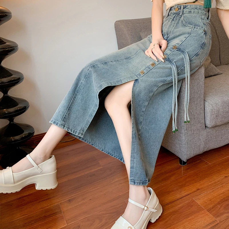 Модная стройнящая джинсовая юбка в стиле ретро на раннюю весну 2024, новый китайский дизайн, женская джинсовая юбка, универсальная юбка с высокой талией