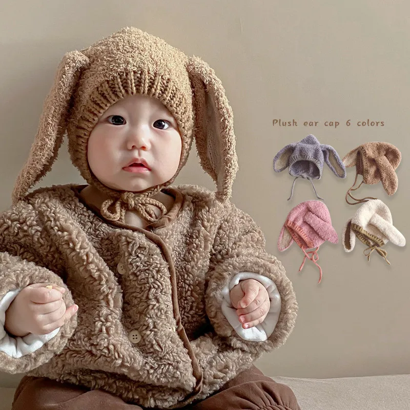 Модная шапка Ins для маленьких мальчиков и девочек, милая мультяшная плюшевая шапка с ушками кролика для малышей, осенне-зимняя плотная тепла...