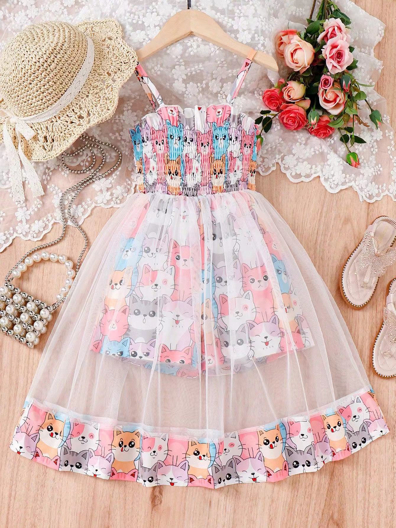 Модное летнее платье для девочек с милым мультяшным принтом, шорты на подкладке с подтяжками, сетчатое платье в стиле пэчворк 7Y разноцветный