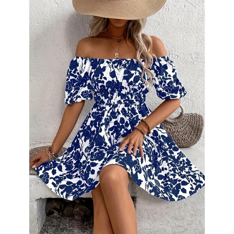 Модное летнее платье с принтом, повседневное, с открытыми плечами, с короткими рукавами, свободного кроя, простое, А-силуэта, для вечеринки, короткое, приталенное, элегантная праздничная одежда L синий