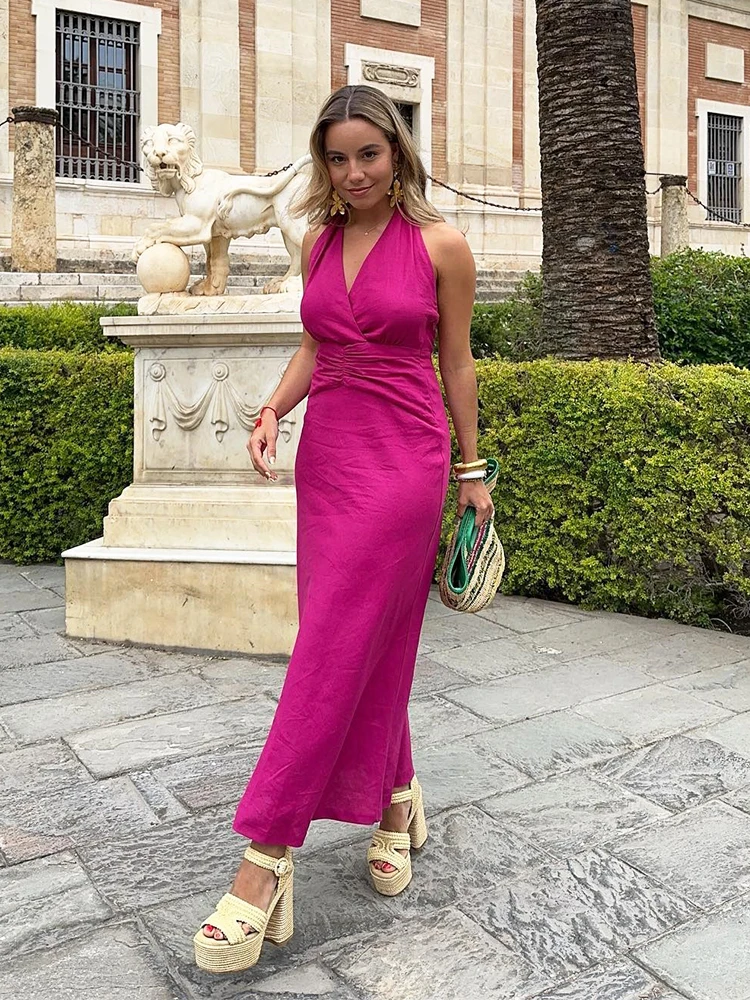 Модное однотонное льняное платье розового цвета с V-образным вырезом, сексуальное летнее женское платье с открытой спиной и лямкой на шее, женское платье-макси на бретелях