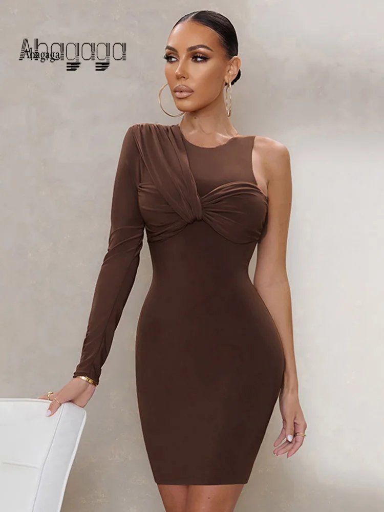 Модное однотонное уличное платье AHAgaga с длинным рукавом и круглым вырезом, облегающее женское платье-футляр на одно плечо