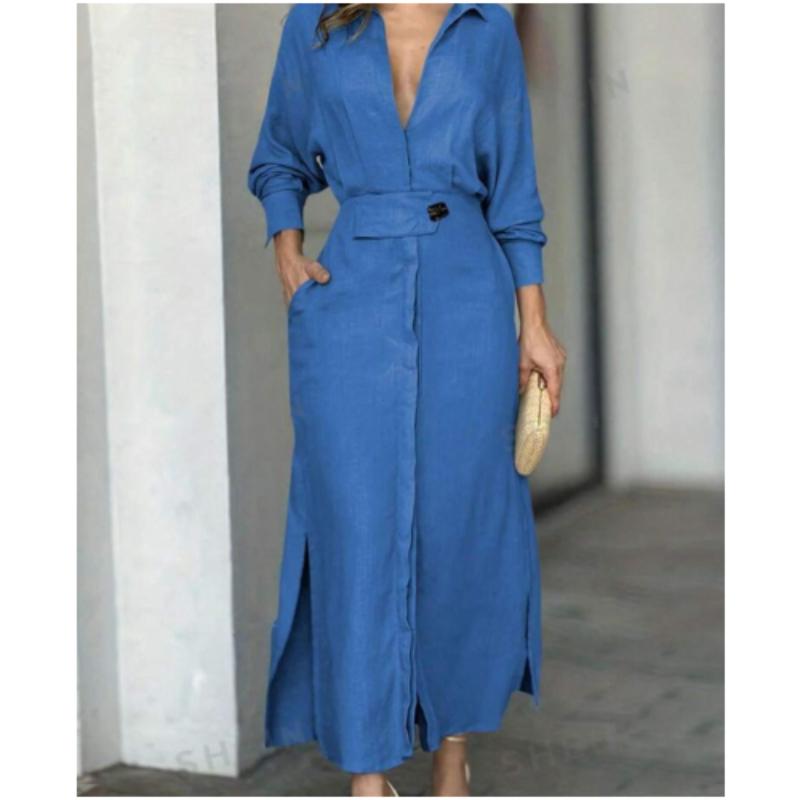 Модное платье для женщин, роскошное элегантное однотонное платье, осеннее вечернее платье с карманами и длинными рукавами, нерегулярные платья-рубашки XXS синий