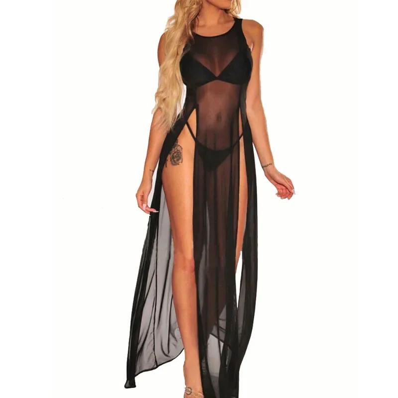 Модное прозрачное сексуальное длинное спальное платье с разрезом, супер эластичное многоцветное сетчатое пляжное платье, женская ночная рубашка, нижнее белье, платье XXL чёрный
