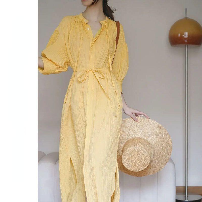 Модное французское платье с v-образным вырезом — женское летнее платье с короткими рукавами и поясом M жёлтый