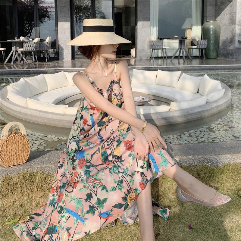 Модное элегантное пляжное платье для отдыха с V-образным вырезом, женское винтажное цветочное платье А-силуэта, повседневные платья больших размеров с открытой спиной, облегающее платье со свободными бретелями 26370 L розовый