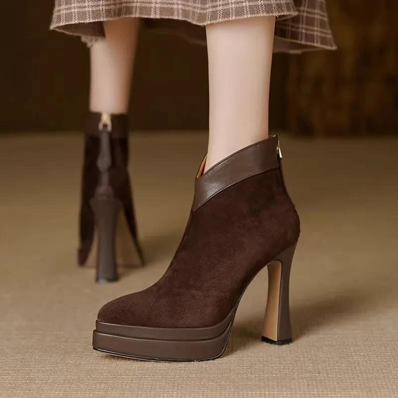 Модные Удобные Ботильоны на Высоком Каблуке с Острым Носком Водонепроницаемая Платформа Застежка-молния Сзади Коричневые V-образные Ботильоны из Флока Модный Ретро Стиль 38 коричневый
