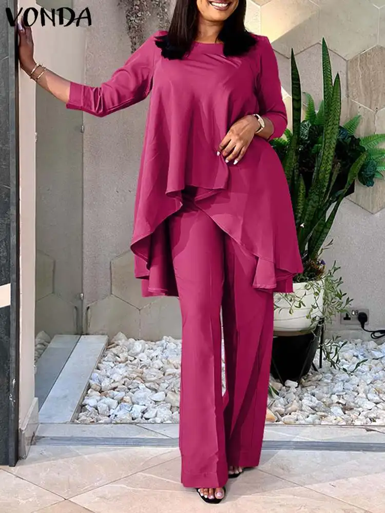Модные брючные костюмы размера плюс 5XL VONDA 2024, женские асимметричные топы с длинным рукавом и эластичная талия, повседневные однотонные костюмы, комплект из 2 предметов