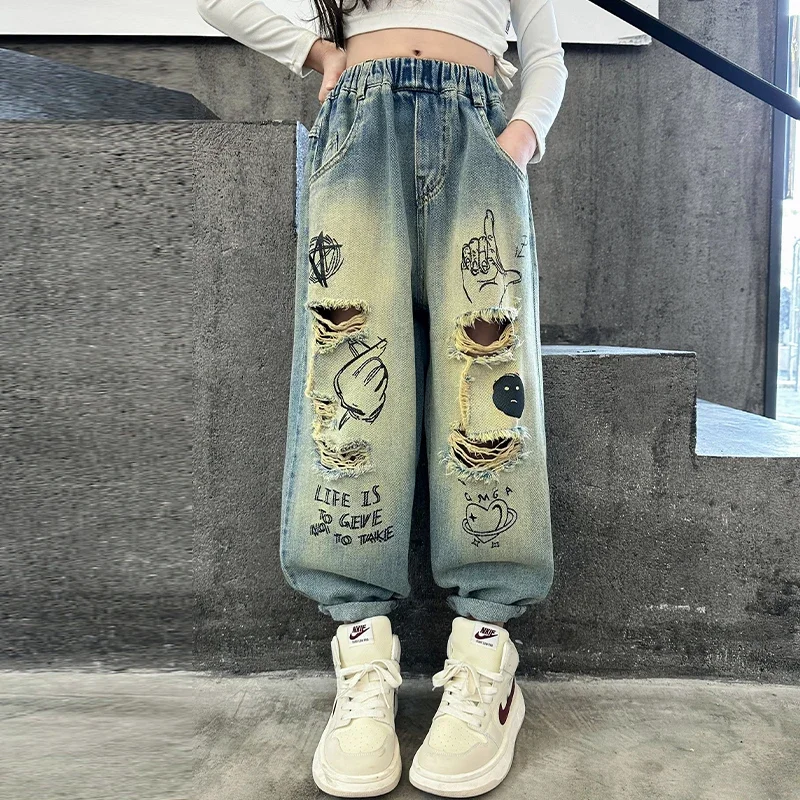 Модные джинсовые брюки для девочек-подростков, детские брюки, уличные повседневные универсальные детские джинсовые брюки