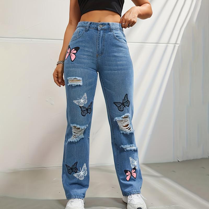 Модные джинсовые брюки прямого кроя с высокой талией и рваными отверстиями, с принтом бабочек, женские джинсовые брюки разных цветов XL синий