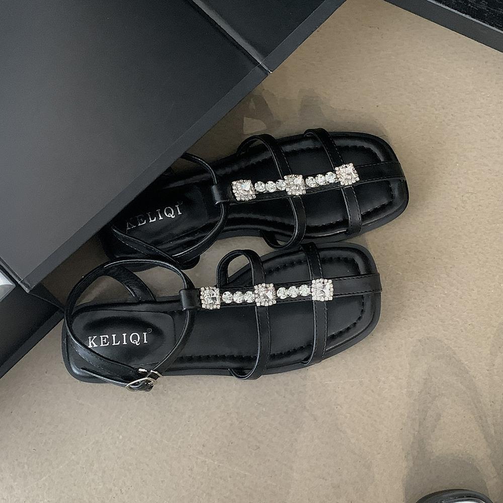 Модные женские босоножки с открытым носком на плоской подошве с низким каблуком, серебристо-черные, со стразами, с цепочкой на щиколотке, с пряжкой, модные блестящие босоножки, тапочки, мюли 5.5 чёрный