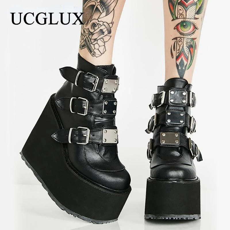 Модные женские ботинки в стиле панк с круглым носком на толстой подошве и высоком каблуке, женские кожаные ботинки с пряжкой и ремешком, женские ботинки