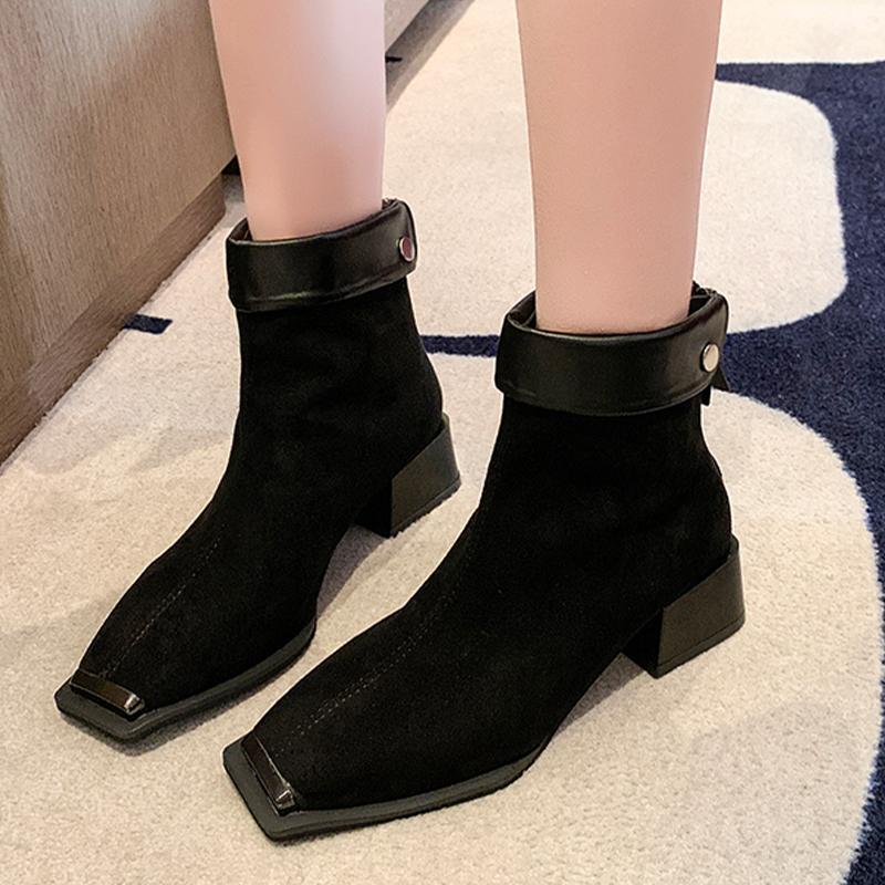 Модные женские замшевые ботильоны с леопардовым принтом, туфли на среднем каблуке с квадратным носком, женская мода 2025 года, новые зимние мотоциклетные ботинки Mujer Botas 40 чёрный