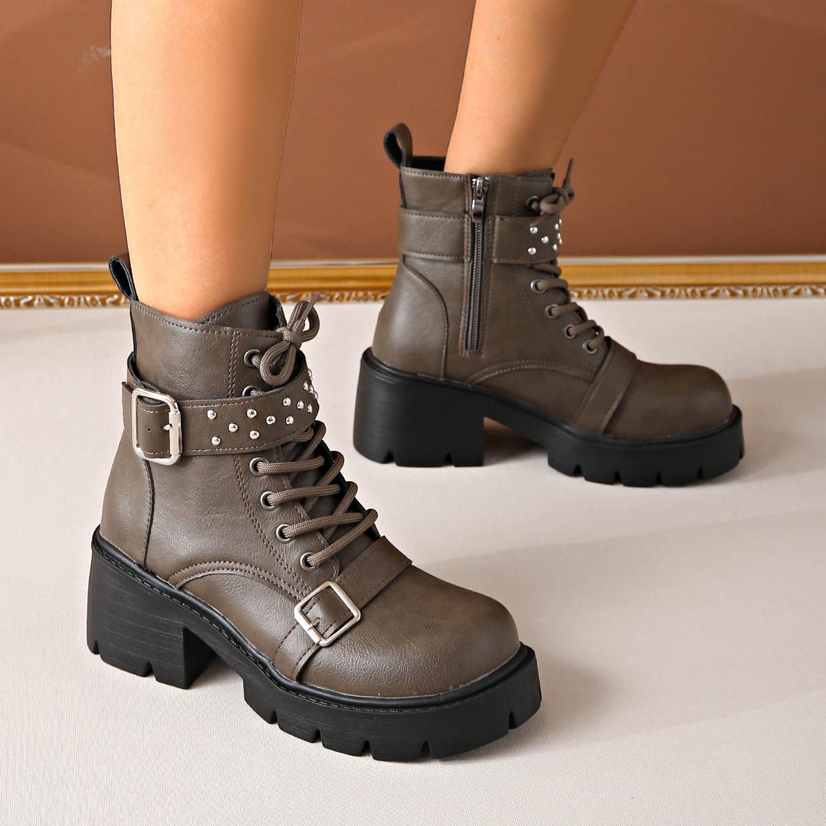 Модные женские кожаные ботильоны с заклепками и шнуровкой, женские мотоботы на толстом каблуке большого размера с пряжкой-ремнем 35 серый