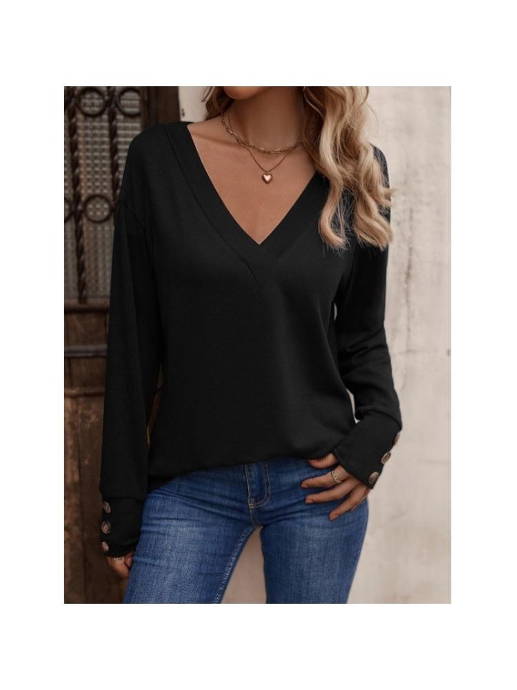 Модные женские повседневные топы, однотонные, с V-образным вырезом, свободные, с длинными рукавами, застегивающиеся на пуговицы, удобные и универсальные футболки для женщин XXL чёрный