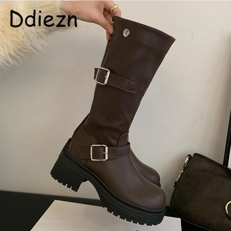 Модные женские сапоги до колена с пряжкой, осень 2023, женская обувь с круглым носком, длинные женские рыцарские сапоги на массивном каблуке