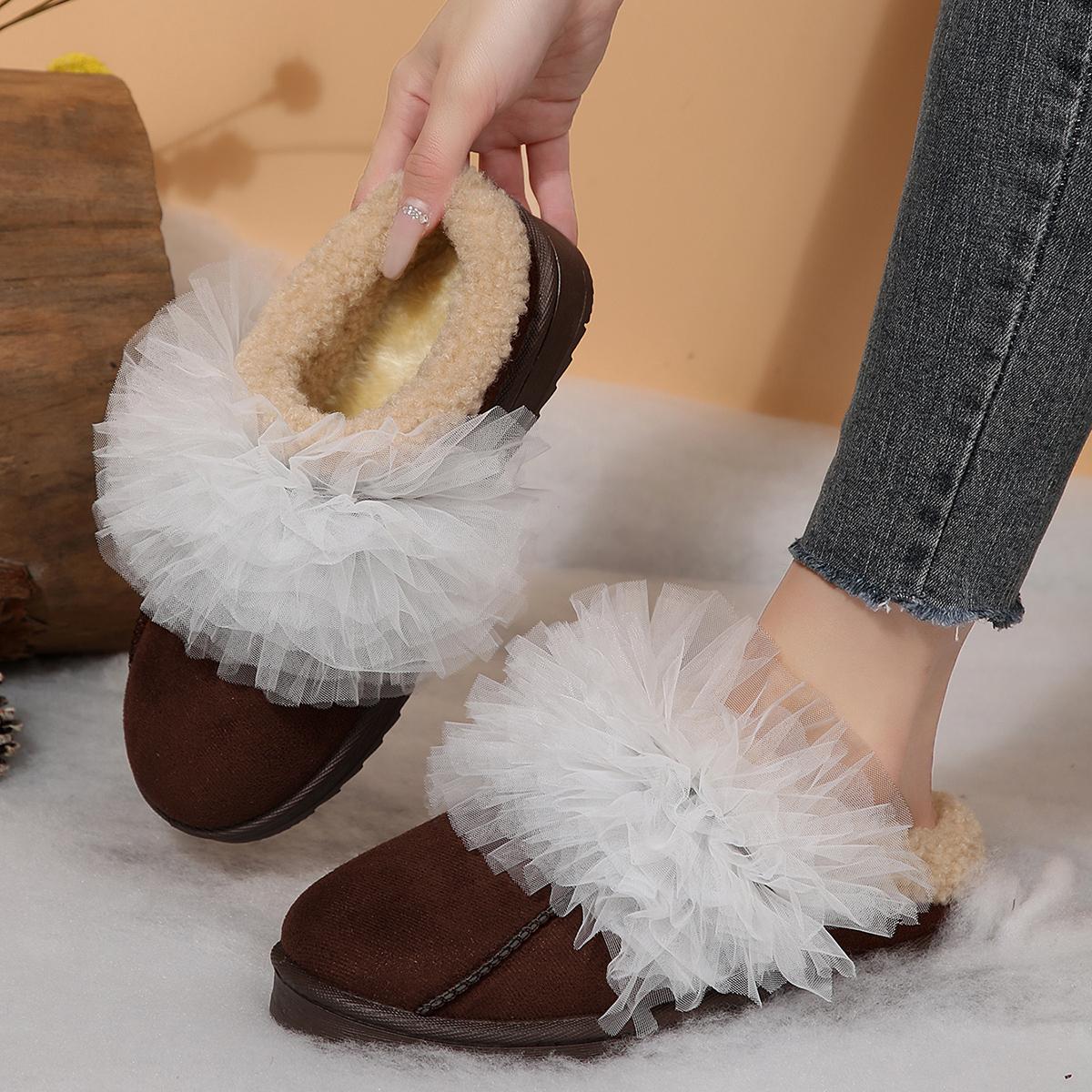 Модные женские элегантные хлопковые домашние тапочки, украшенные марлей, теплые, с коротким плюшем, мягкие, нескользящие, плюшевые тапочки для спальни на зиму. 44 шоколадный