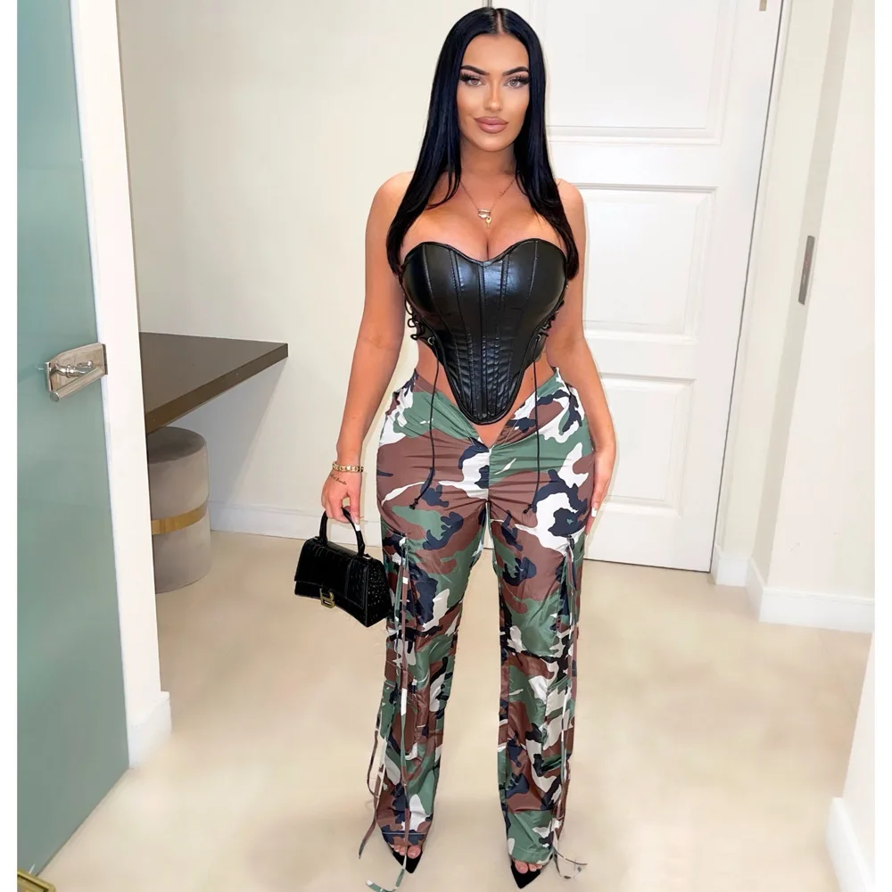 Модные камуфляжные брюки-карго с рюшами, низким V-образным вырезом и боковыми карманами, 2023, женские сексуальные асимметричные брюки в стиле Хай-стрит с Кулиской