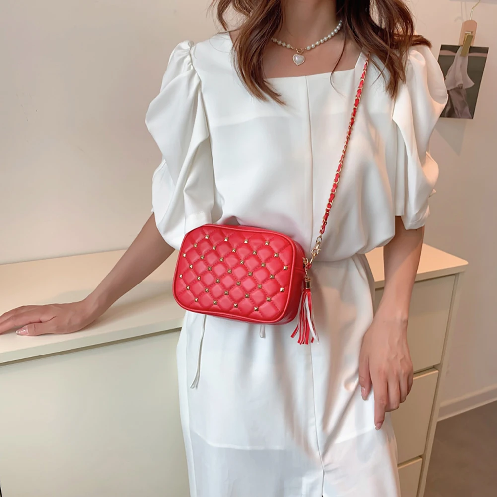 Модные кожаные сумки через плечо для женщин, маленькие квадратные сумочки на плечо с кисточками для путешествий, повседневный кошелек для к...