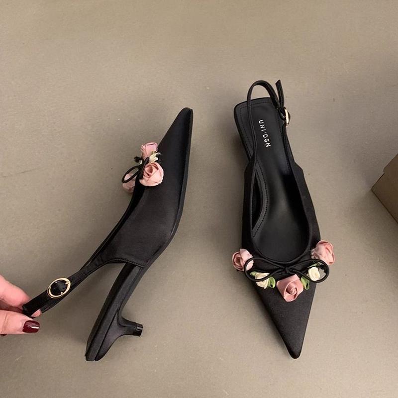 Модные милые сандалии из шелка с цветочным декором женские с ремешком на пятке летние туфли для вечеринок с острым носком розовые цветочные сандалии женские с бантом сандалии 36 чёрный