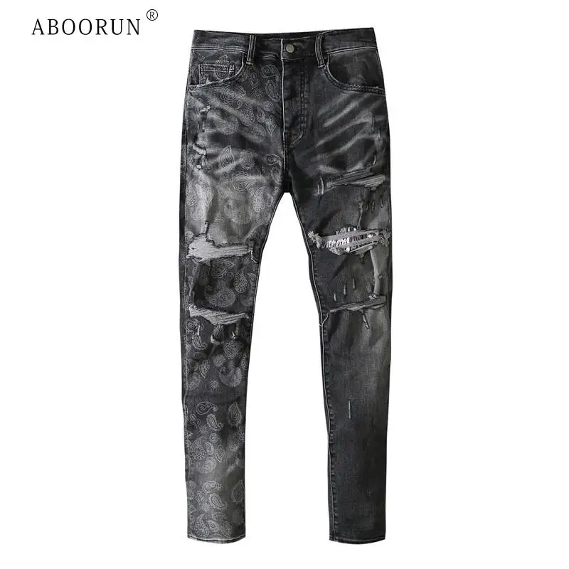 Модные мужские джинсы ABOORUN Hi Street в стиле пэчворк с цветком кешью, уличная одежда, черные рваные джинсовые брюки-карандаш с дырками для мужчин