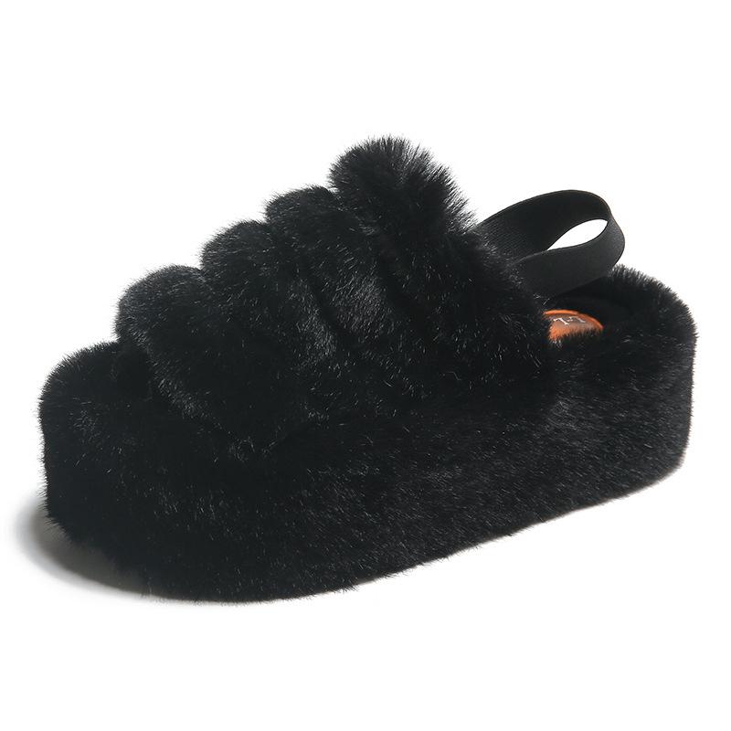 Модные новые большие размеры 6 см толстые эластичные каблуки с тапочками женские теплые плюшевые тапочки для улицы дома 42 чёрный